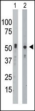 Western blot analysis of BCKDK (arrow) using rabbit polyclonal BCKDK Antibody (C-term T340) (RB05257).293 cell lysates (2 ug/lane) either nontransfected (Lane 1) or transiently transfected with the BCKDK gene (Lane 2) (Origene Technologies). |