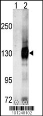 Western blot analysis of CASK (arrow) using Cask Antibody (C-term) (Cat. APR11564G). 293 cell lysates (2 ug/lane) either nontransfected (Lane 1) or transiently transfected with the CASK gene (Lane 2) (Origene Technologies).