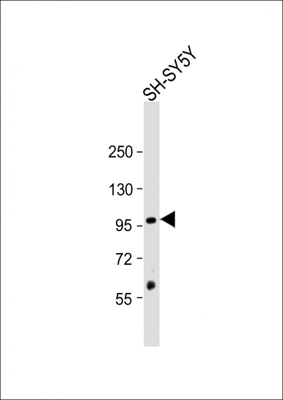 Anti-CASK (Center K227) Antibody at 1:1000 dilution + SH-SY5Y whole cell lysate Lysates/proteins at 20 μg per lane. Secondary Goat Anti-Rabbit IgG, (H+L), Peroxidase conjugated at 1/10000 dilution. Predicted band size : 105 kDa Blocking/Dilution buffer: 5% NFDM/TBST.