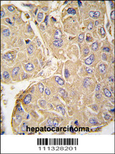 Formalin-fixed and paraffin-embedded human hepatocarcinoma tissue reacted with PTPN7 Antibody (S44) (Cat. AMM07402G), which was peroxidase-conjugated to the secondary antibody, followed by DAB staining. This data demonstrates the use of this antibody for immunohistochemistry; clinical relevance has not been evaluated. |