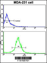 Flow cytometric analysis of MDA-231 cells using ACTN4 Antibody (C-term)(bottom histogram) compared to a negative control cell (top histogram). FITC-conjugated goat-anti-rabbit secondary antibodies were used for the analysis. |