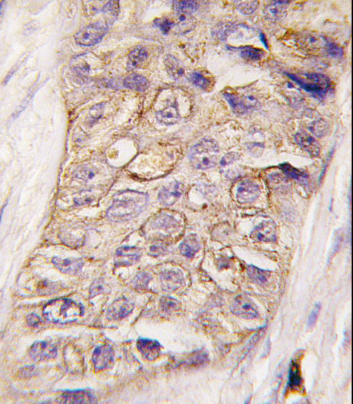 Formalin-fixed and paraffin-embedded human breast carcinoma tissue reacted with PI3KC2B antibody (N-term), which was peroxidase-conjugated to the secondary antibody, followed by DAB staining. This data demonstrates the use of this antibody for immunohistochemistry; clinical relevance has not been evaluated. |