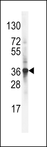 Western blot analysis of LDLRAP1 Antibody (C-term) (Cat. APG01981G) in NCI-H460 cell line lysates (35ug/lane). LDLRAP1 (arrow) was detected using the purified Pab.