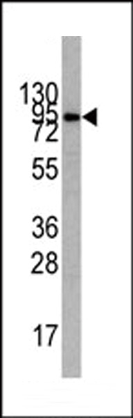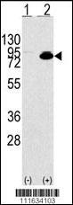 Western blot analysis of anti-PI3KR1 Antibody (N-term L11) Pab (Cat. APR07161G) in 293 cell line lysates transiently transfected with the PIK3R1 gene (3ug/lane). PI3KR1(arrow) was detected using the purified Pab. |