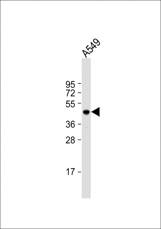 Anti-NME7 Antibody (V40) at 1:1000 dilution + A549 whole cell lysate Lysates/proteins at 20 μg per lane. Secondary Goat Anti-Rabbit IgG, (H+L), Peroxidase conjugated at 1/10000 dilution. Predicted band size : 42 kDa Blocking/Dilution buffer: 5% NFDM/TBST.