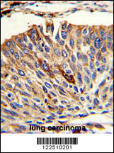 Formalin-fixed and paraffin-embedded human lung carcinoma with VTI1A Antibody (C-term), which was peroxidase-conjugated to the secondary antibody, followed by DAB staining. This data demonstrates the use of this antibody for immunohistochemistry; clinical relevance has not been evaluated.