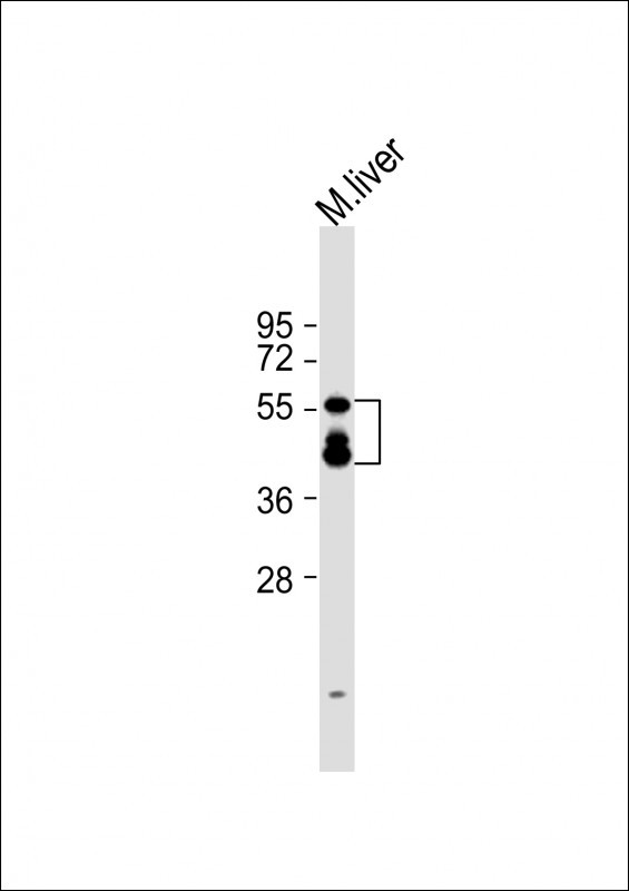 Anti-KMO Antibody (Center) at 1:2000 dilution + mouse liver lysate Lysates/proteins at 20 μg per lane. Secondary Goat Anti-Rabbit IgG, (H+L), Peroxidase conjugated at 1/10000 dilution. Predicted band size : 56 kDa Blocking/Dilution buffer: 5% NFDM/TBST.