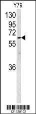 Western blot analysis of NEURL Antibody (Center) (Cat. AMM06621G) in Y79 cell line lysates (35ug/lane). NEURL (arrow) was detected using the purified Pab.