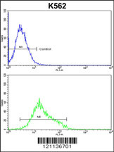 MFN2 Antibody (Center)(Cat. APR08442G) flow cytometric analysis of k562 cells (bottom histogram) compared to a negative control cell (top histogram).FITC-conjugated goat-anti-rabbit secondary antibodies were used for the analysis. |