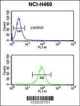 EXOC5 Antibody (C-term) (Cat. APR15892G) flow cytometric analysis of NCI-H460 cells (bottom histogram) compared to a negative control cell (top histogram).FITC-conjugated goat-anti-rabbit secondary antibodies were used for the analysis. |