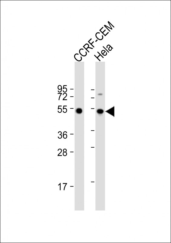 All lanes : Anti-TBB1 Antibody at 1:2000 dilution Lane 1: CCRF-CEM whole cell lysate Lane 2: Hela whole cell lysate Lysates/proteins at 20 μg per lane. Secondary Goat Anti-Rabbit IgG, (H+L), Peroxidase conjugated at 1/10000 dilution. Predicted band size : 50 kDa Blocking/Dilution buffer: 5% NFDM/TBST.
