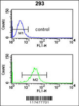 NUP153 Antibody (N-term)(Cat. APR17646G) flow cytometry analysis of 293 cells (bottom histogram) compared to a negative control cell (top histogram).FITC-conjugated goat-anti-rabbit secondary antibodies were used for the analysis. |