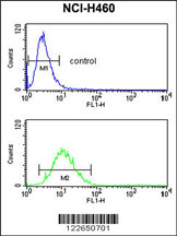 SLC25A17 Antibody (N-term) (Cat. APR10047G) flow cytometry analysis of NCI-H460 cells (bottom histogram) compared to a negative control cell (top histogram).FITC-conjugated goat-anti-rabbit secondary antibodies were used for the analysis. |