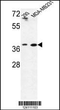 Western blot analysis of MAT2B Antibody (N-term) (Cat. APR08338G) in293,MDA-MB231 cell line lysates (35ug/lane). MAT2B (arrow) was detected using the purified Pab.
