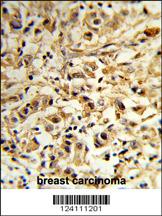 Formalin-fixed and paraffin-embedded human breast carcinoma reacted with MAT2B Antibody (N-term), which was peroxidase-conjugated to the secondary antibody, followed by DAB staining. This data demonstrates the use of this antibody for immunohistochemistry; clinical relevance has not been evaluated. |