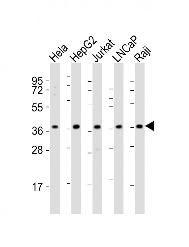 All lanes : Anti-DFFB Antibody (N-term) at 1:2000 dilution Lane 1: Hela whole cell lysates Lane 2: HepG2 whole cell lysates Lane 3: Jurkat whole cell lysates Lane 4: LNCaP whole cell lysates Lane 5: Raji whole cell lysates Lysates/proteins at 20 μg per lane. Secondary Goat Anti-Rabbit IgG, (H+L), Peroxidase conjugated at 1/10000 dilution Predicted band size : 39 kDa Blocking/Dilution buffer: 5% NFDM/TBST.