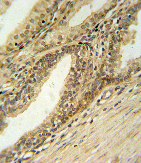 DFFB Antibody (N-term) (Cat. APR07567G) IHC analysis in formalin fixed and paraffin embedded prostate carcinoma followed by peroxidase conjugation of the secondary antibody and DAB staining. This data demonstrates the use of the DFFB Antibody (N-term) for immunohistochemistry. Clinical relevance has not been evaluated. |