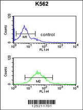 DEN1A Antibody (C-term) (Cat. APR11729G) flow cytometric analysis of K562 cells (bottom histogram) compared to a negative control cell (top histogram).FITC-conjugated goat-anti-rabbit secondary antibodies were used for the analysis. |