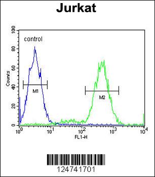 IMP2L Antibody (Center) (Cat. APR07993G) flow cytometric analysis of Jurkat cells (right histogram) compared to a negative control cell (left histogram).FITC-conjugated goat-anti-rabbit secondary antibodies were used for the analysis. |