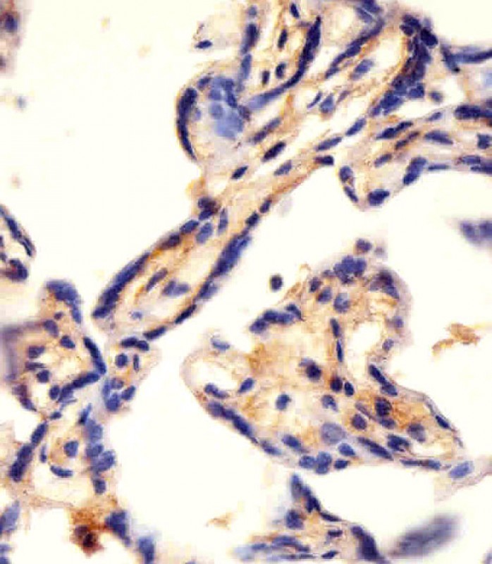 APG02331G staining CAD in human placenta tissue sections by Immunohistochemistry (IHC-P - paraformaldehyde-fixed, paraffin-embedded sections). Tissue was fixed with formaldehyde and blocked with 3% BSA for 0. 5 hour at room temperature; antigen retrieval was by heat mediation with a citrate buffer (pH6). Samples were incubated with primary antibody (1/25) for 1 hours at 37°C. A undiluted biotinylated goat polyvalent antibody was used as the secondary antibody.