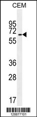 UNCX Antibody (C-term) (Cat. APR13953G) western blot analysis in CEM cell line lysates (35ug/lane).This demonstrates the UNCX antibody detected the UNCX protein (arrow). |