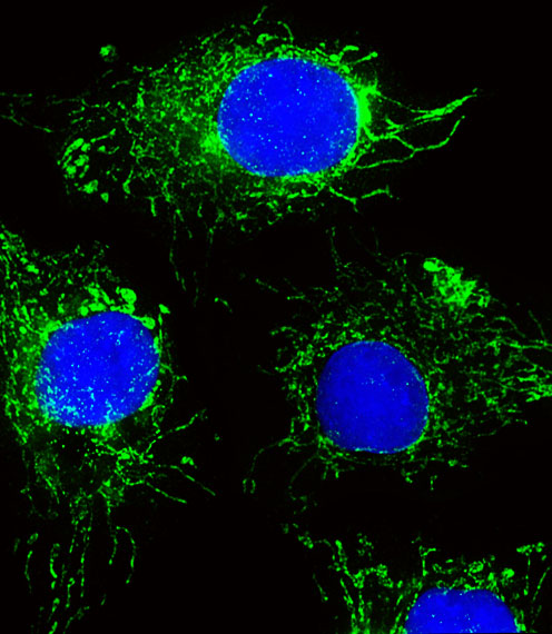 Fluorescent image of HepG2 cells stained with NDUFC2 Antibody (N-term) ( APR08676G). APR08676G was diluted at 1:25 dilution. An Alexa Fluor 488-conjugated goat anti-rabbit lgG at 1:400 dilution was used as the secondary antibody (green). DAPI was used to stain the cell nuclear (blue).