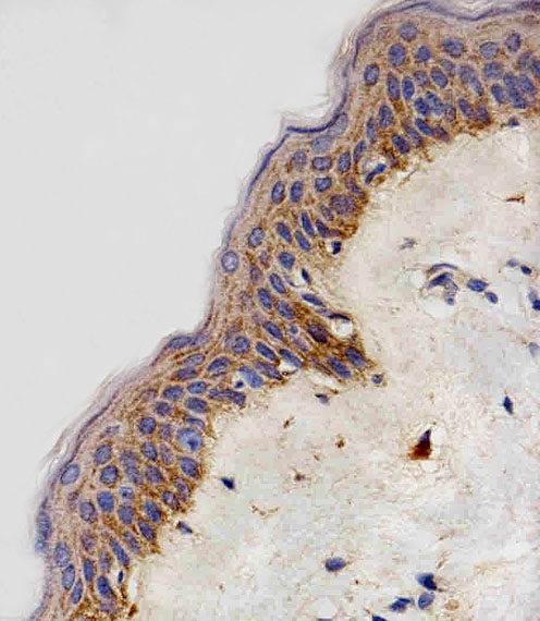 Immunohistochemical analysis of paraffin-embedded H. skin section using NDUFB4 Antibody (N-term)( APR08668G). APR08668G was diluted at 1:100 dilution. A peroxidase-conjugated goat anti-rabbit IgG at 1:400 dilution was used as the secondary antibody, followed by DAB staining.