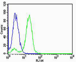 Flow cytometric analysis of Hela cells using NDUFB4 Antibody (N-term)(green, APR08668G) compared to an isotype control of rabbit IgG(blue). APR08668G was diluted at 1:25 dilution. An Alexa Fluor? 488 goat anti-rabbit lgG at 1:400 dilution was used as the secondary antibody. |