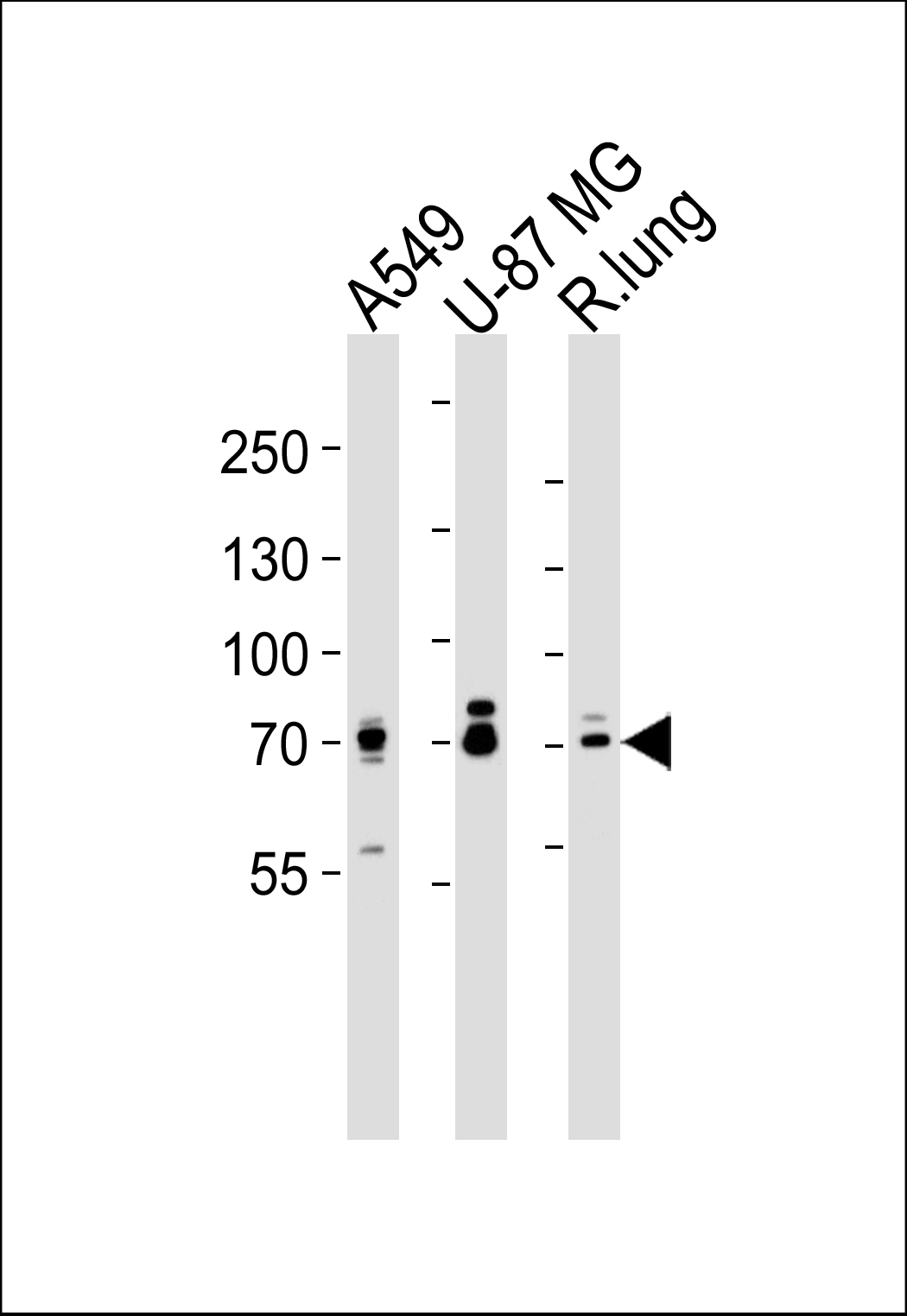 Western blot analysis of lysates from A549, U-87 MG cell line and rat lung tissue lysate(from left to right), using SEMA4F Antibody (C-term)( APR13251G). APR13251G was diluted at 1:1000 at each lane. A goat anti-rabbit IgG H&L(HRP) at 1:5000 dilution was used as the secondary antibody. Lysates at 35ug per lane. |