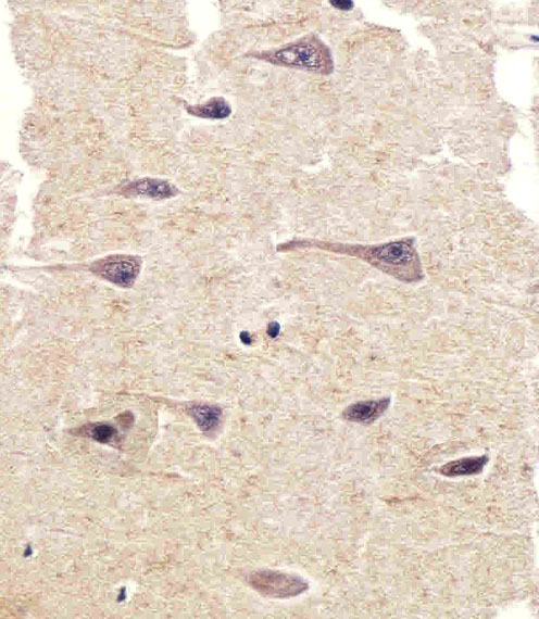 Immunohistochemical analysis of paraffin-embedded H.brain section using PTK2B Antibody (C-term)( AMR09634G). AMR09634G was diluted at 1:25 dilution. A peroxidase-conjugated goat anti-rabbit IgG at 1:400 dilution was used as the secondary antibody, followed by DAB staining.