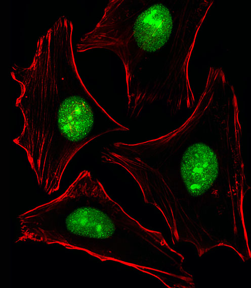 Fluorescent image of Hela cells stained with XAF1 PTK2B Antibody (C-term)( AMR09634G). AMR09634G was diluted at 1:25 dilution. An Alexa Fluor 488-conjugated goat anti-rabbit lgG at 1:400 dilution was used as the secondary antibody (green). Cytoplasmic actin was counterstained with Alexa Fluor? 555 conjugated with Phalloidin (red).