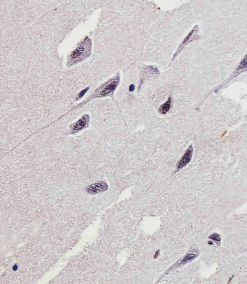 Immunohistochemical analysis of paraffin-embedded H. brain section using PTK2B Antibody (C-term)( AMR09635G). AMR09635G was diluted at 1:25 dilution. A peroxidase-conjugated goat anti-rabbit IgG at 1:400 dilution was used as the secondary antibody, followed by DAB staining.