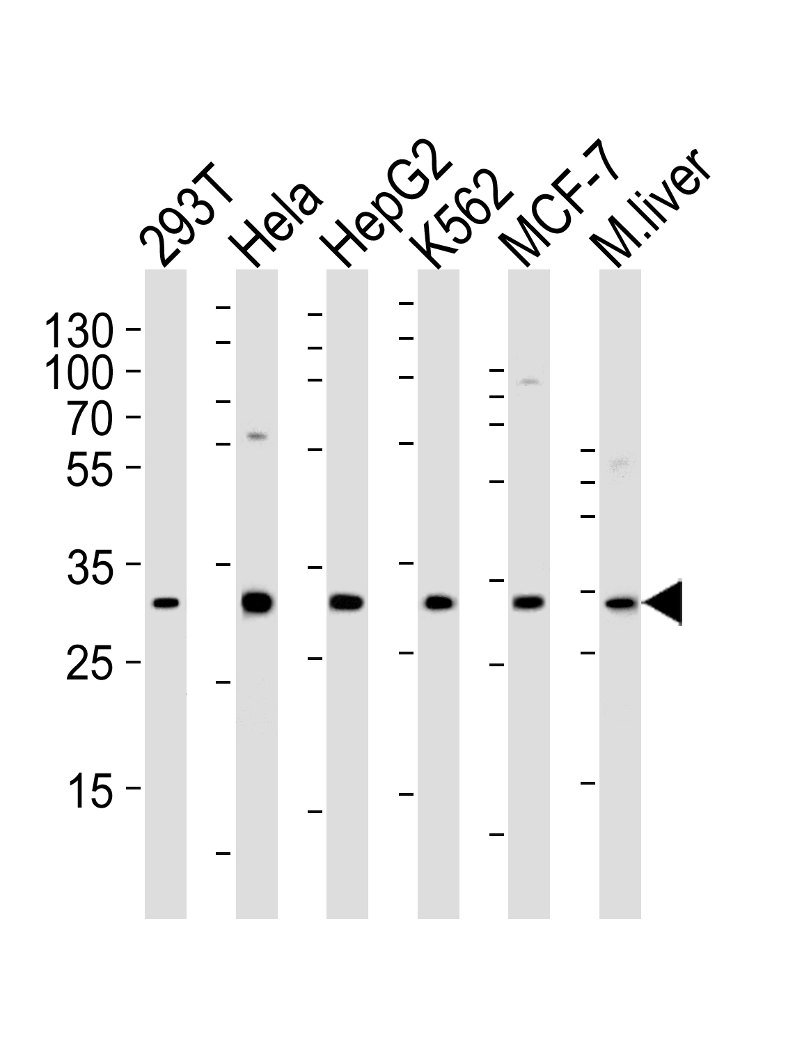 Western blot analysis of lysates from 293T, Hela, HepG2, K562, MCF-7 cell line and mouse liver tissue lysate(from left to right), using SIP1 Antibody (C-term)( APR13343G). APR13343G was diluted at 1:1000 at each lane. A goat anti-rabbit IgG H&L(HRP) at 1:5000 dilution was used as the secondary antibody. Lysates at 35ug per lane. |
