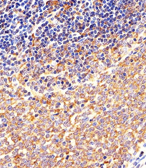 Immunohistochemical analysis of paraffin-embedded M.spleen section using Mouse Csk Antibody (N-term)( APR17416G). APR17416G was diluted at 1:25 dilution. A peroxidase-conjugated goat anti-rabbit IgG at 1:400 dilution was used as the secondary antibody, followed by DAB staining.