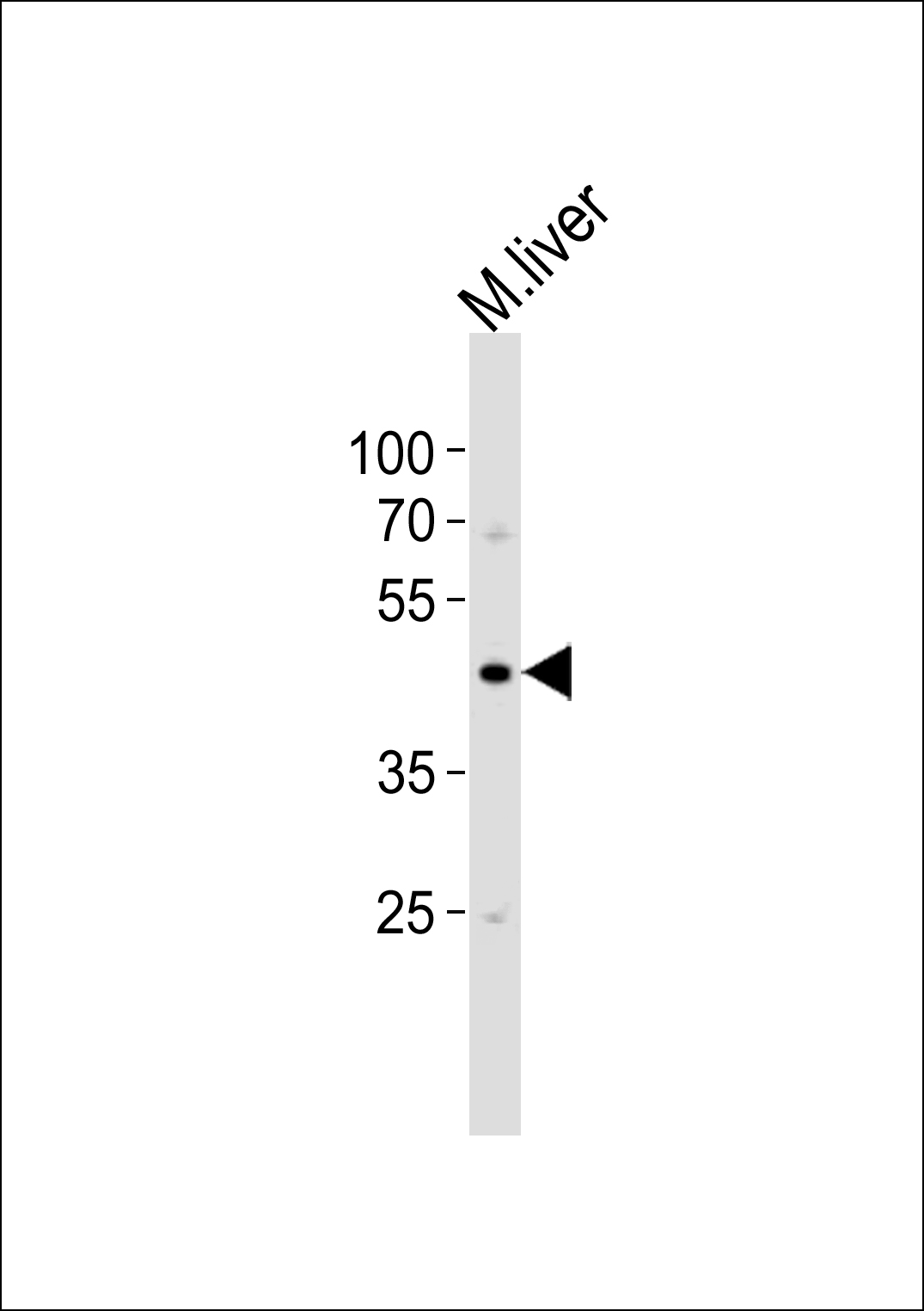 Western blot analysis of lysate from mouse liver tissue lysate, using Mouse Csk Antibody (N-term)( APR17416G). APR17416G was diluted at 1:1000. A goat anti-rabbit IgG H&L(HRP) at 1:5000 dilution was used as the secondary antibody. Lysate at 35ug. |