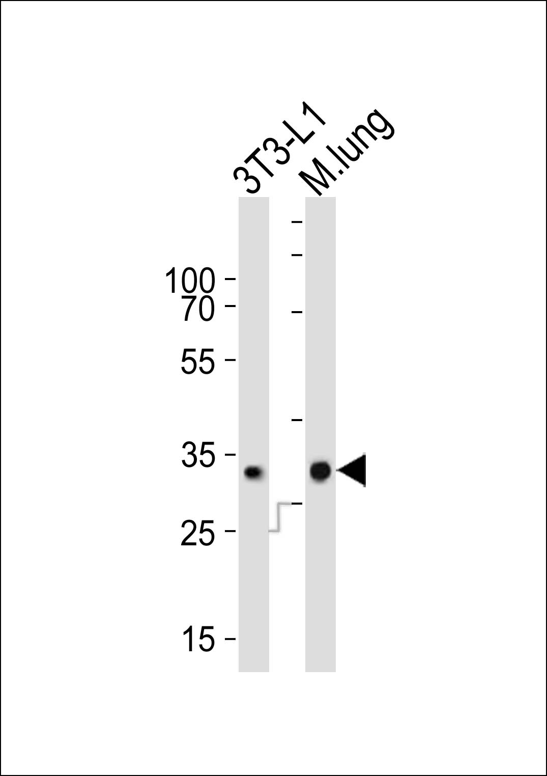 Western blot analysis of lysates from mouse 3T3-L1 cell line and mouse lung tissue (from left to right), using CHMP3 Antibody (N-term)( APR15421G). APR15421G was diluted at 1:1000 at each lane. A goat anti-rabbit IgG H&L(HRP) at 1:10000 dilution was used as the secondary antibody. Lysates at 20ug per lane.