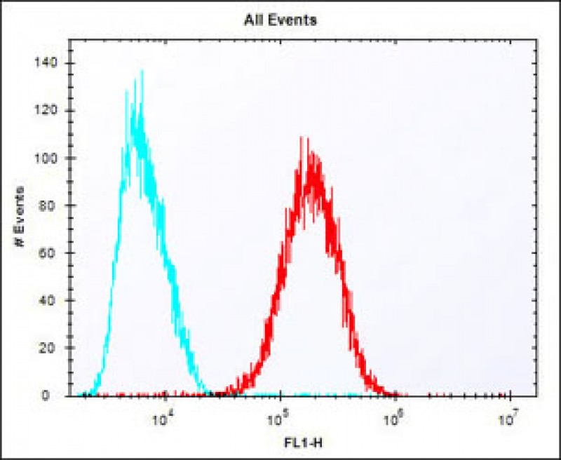 Overlay histogram showing HepG2 cells stained with APR10330G (red line). The cells were fixed with 2% paraformaldehyde (10 min) and then permeabilized with 90% methanol for 10 min. The cells were then icubated in 2% bovine serum albumin to block non-specific protein-protein interactions followed by the antibody (APR10330G, 1:25 dilution) for 60 min at 37?C. The secondary antibody used was Alexa Fluor? 488 goat anti-rabbit lgG (H+L) (1583138) at 1/400 dilution for 40 min at 37?C. Isotype control antibody (blue line) was rabbit IgG1 (1μg/1x10^6 cells) used under the same conditions. Acquisition of >10, 000 events was performed.
