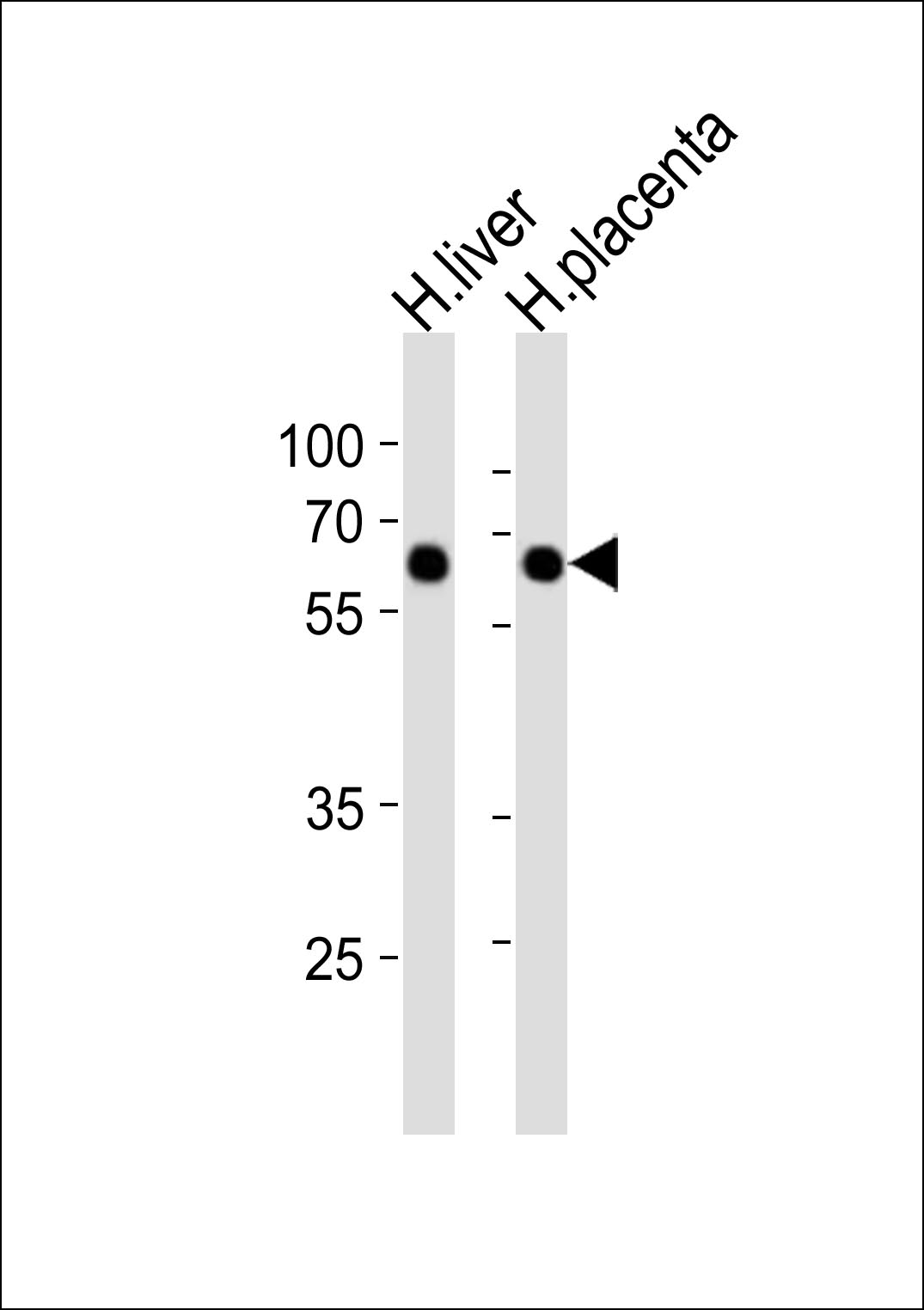 Western blot analysis of lysates from human liver, human placenta tissue lysate (from left to right), using SCP2 Antibody (C-term)(Cat. AMR09840G). AMR09840G was diluted at 1:1000 at each lane. A goat anti-rabbit IgG H&L(HRP) at 1:10000 dilution was used as the secondary antibody. Lysates at 20ug per lane. |