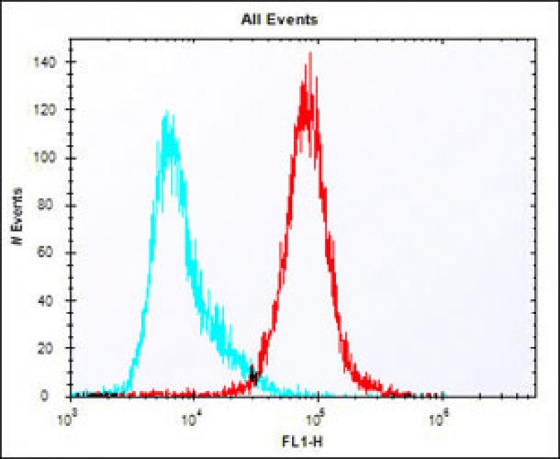Overlay histogram showing colon26 cells stained with APR10975G (red line). The cells were fixed with 2% paraformaldehyde (10 min) and then permeabilized with 90% methanol for 10 min. The cells were then icubated in 2% bovine serum albumin to block non-specific protein-protein interactions followed by the antibody (APR10975G, 1:25 dilution) for 60 min at 37?C. The secondary antibody used was Alexa Fluor? 488 goat anti-rabbit lgG (H+L) (1583138) at 1/400 dilution for 40 min at 37?C. Isotype control antibody (blue line) was rabbit IgG1 (1μg/1x10^6 cells) used under the same conditions. Acquisition of >10, 000 events was performed.