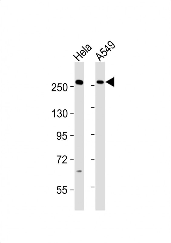 All lanes : Anti-PLXNB1 Antibody (C-term) at 1:2000 dilution Lane 1: Hela whole cell lysates Lane 2: A549 whole cell lysates Lysates/proteins at 20 μg per lane. Secondary Goat Anti-Rabbit IgG, (H+L), Peroxidase conjugated at 1/10000 dilution Predicted band size : 232 kDa Blocking/Dilution buffer: 5% NFDM/TBST. |