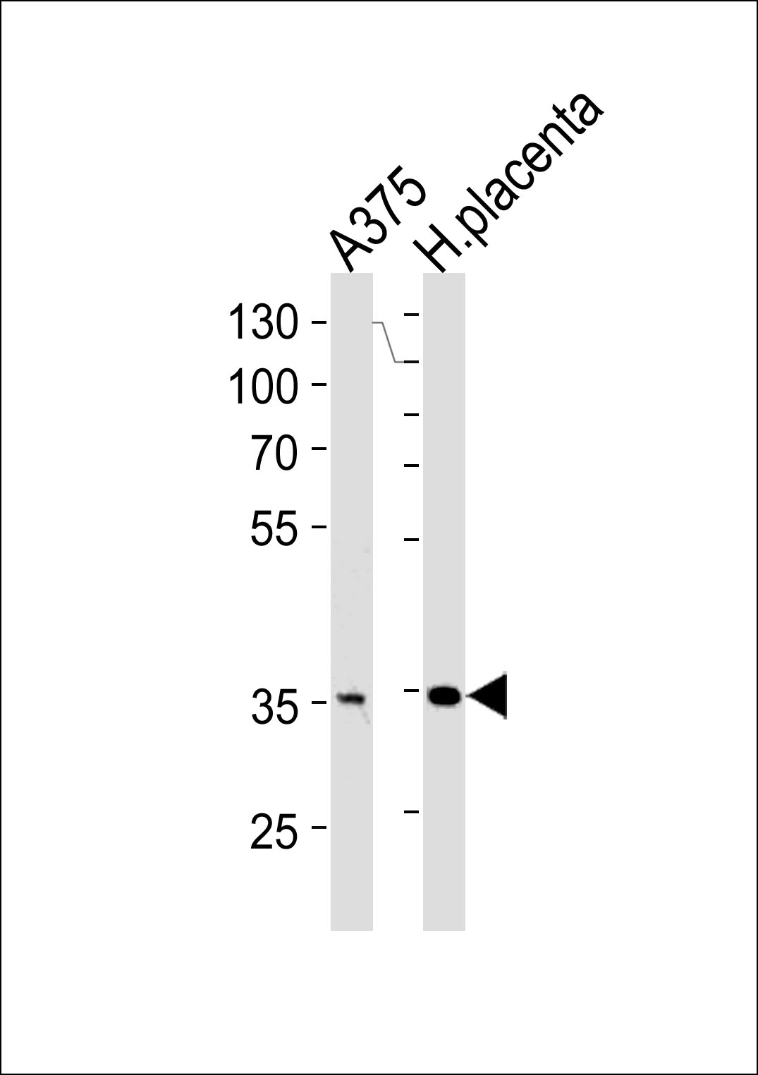 AKR1B1 Antibody (C-term) (Cat. AMM04376G) western blot analysis in A375 cell line and human placenta tissue lysates (35ug/lane).This demonstrates the AKR1B1 antibody detected the AKR1B1 protein (arrow).