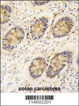Formalin-fixed and paraffin-embedded human colon carcinoma tissue reacted with AKR1B1 antibody (C-term) (Cat. AMM04376G), which was peroxidase-conjugated to the secondary antibody, followed by DAB staining. This data demonstrates the use of this antibody for immunohistochemistry; clinical relevance has not been evaluated.