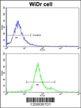 Flow cytometric analysis of widr cells using GSTP1 Antibody (C-term)(bottom histogram) compared to a negative control cell (top histogram)FITC-conjugated goat-anti-rabbit secondary antibodies were used for the analysis.