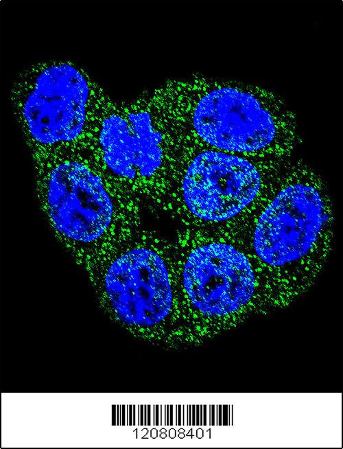 Confocal immunofluorescent analysis of GSTP1 Antibody (C-term)( AMM05266G) with Hela cell followed by Alexa Fluor 488-conjugated goat anti-rabbit lgG (green). DAPI was used to stain the cell nuclear (blue). |