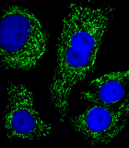 Fluorescent image of SK-BR-3 cells stained with ATP5B Antibody (Center)( APG02111G). APG02111G was diluted at 1:25 dilution. An Alexa Fluor 488-conjugated goat anti-rabbit lgG at 1:400 dilution was used as the secondary antibody (green). DAPI was used to stain the cell nuclear (blue) . |