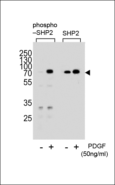 Western blot analysis of lysate from NIH-3T3 cells(from left to right),untreated or treated with PDGF at 50ng/ml,using Phospho-SHP2(Y584) Antibody (Cat. APR12840G) or SHP2 Antibody.Lysate at 15ug per lane.APR12840G was diluted at 1:2000 dilution at each lane. A goat anti-rabbit IgG H&L (HRP) at 1:5000 dilution was used as the secondary antibody.