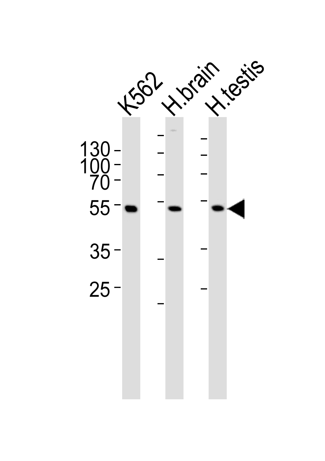 Western blot analysis of lysates from K562 cell line and human brain, testis tissue lysate(from left to right), using GABRG3 Antibody (N-term)( APR11977G). APR11977G was diluted at 1:1000 at each lane. A goat anti-rabbit IgG H&L(HRP) at 1:5000 dilution was used as the secondary antibody. Lysates at 35ug per lane.