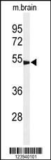 Western blot analysis of GABRG3 Antibody (N-term) (Cat. APR11977G) in mouse brain tissue lysates (35ug/lane). GABRG3 (arrow) was detected using the purified Pab.