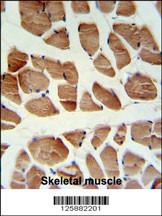 ATP2A1 Antibody (C-term) (Cat. APG02093G) IHC analysis in formalin fixed and paraffin embedded human skeletal muscle followed by peroxidase conjugation of the secondary antibody and DAB staining. This data demonstrates the use of the ATP2A1 Antibody (C-term) for immunohistochemistry. Clinical relevance has not been evaluated.