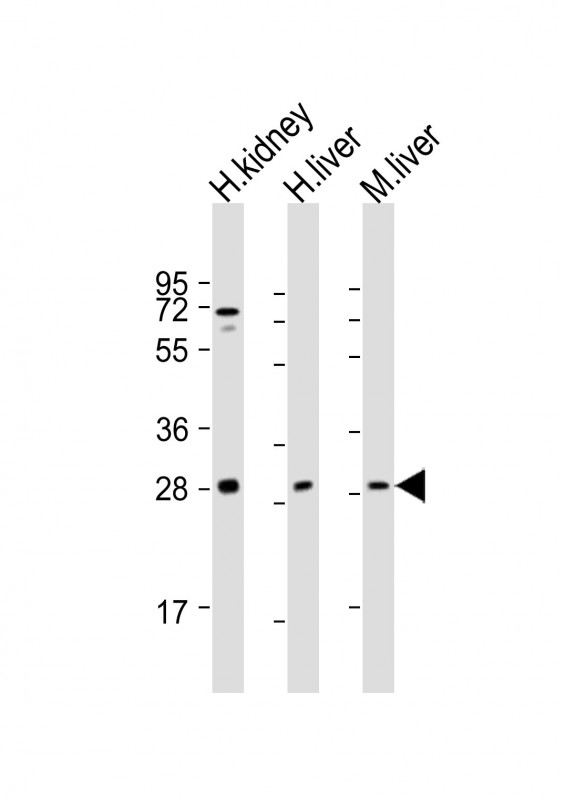 All lanes : Anti-SIRT3 Antibody (C-term) at 1:2000 dilution Lane 1: human kidney lysate Lane 2: human liver lysate Lane 3: mouse liver lysate Lysates/proteins at 20 μg per lane. Secondary Goat Anti-Rabbit IgG, (H+L), Peroxidase conjugated at 1/10000 dilution. Predicted band size : 44 kDa Blocking/Dilution buffer: 5% NFDM/TBST.